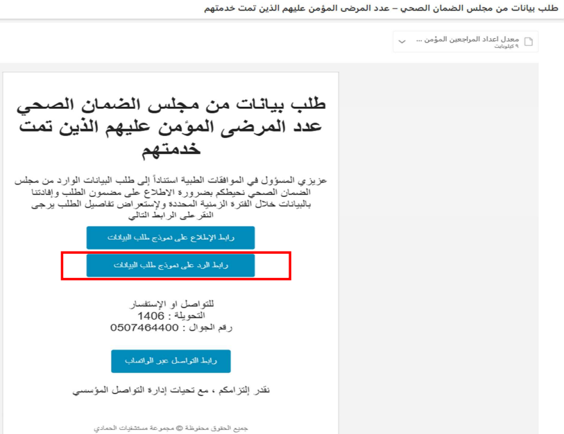 بعد استكمال تعبئة البيانات، يعود المسؤول إلى البريد الذي يحتوي على إشعار الطلب، وينقر على رابط الرد على نموذج طلب البيانات لتقديم الرد الرسمي وإرفاق أي مستندات داعمة.