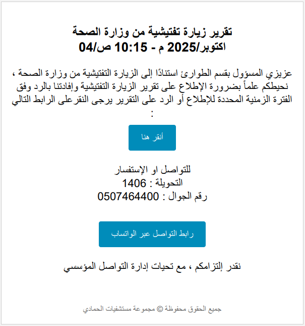 تتيح منصة التواصل المؤسسي الإلكترونية خاصية متابعة الزيارات التفتيشية التي تُجريها الجهات التنظيمية والإشرافية للمستشفى، بهدف توثيق الملاحظات وضمان سرعة معالجتها ضمن إطار مؤسسي منظم.