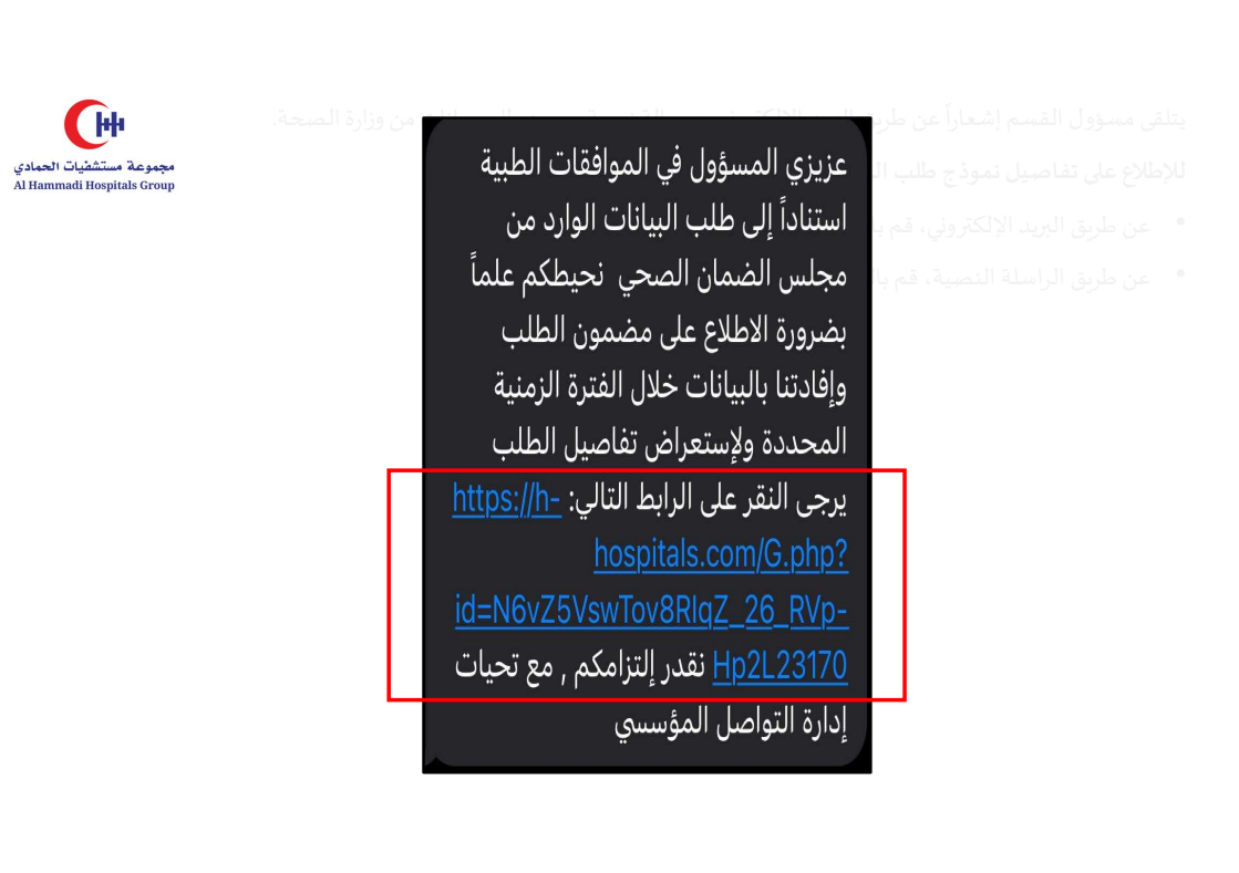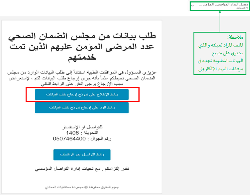 إذا ورد إلى إدارة التواصل المؤسسي إشعارٌ من جهة خارجية (مثل وزارة الصحة) يُفيد بعدم اكتمال البيانات أو عدم وضوحها في الملفات المستلمة من القسم المعني، فتتم إعادة طلب البيانات إلى القسم لاستكمال النواقص وتوضيح الملاحظات.