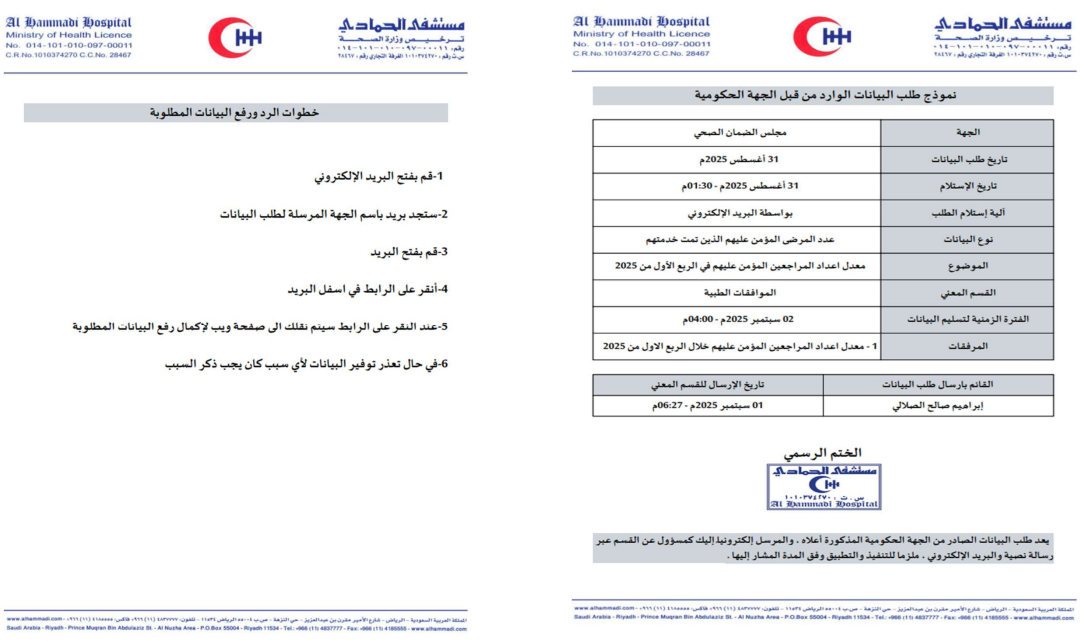 تأتي خدمة طلب البيانات من الجهات الحكومية لتوحيد دورة العمل بين إدارات المستشفى والجهات التنظيمية عبر قناة رسمية واحدة تضمن دقّة المحتوى، سرعة الاستجابة، وتوثيق كل خطوة من الاستلام حتى الإرسال، مع وضوح الأدوار والمسؤوليات وإمكانية المتابعة اللاحقة. حيث تبدأ الخدمة عند ورود طلب رسمي للبيانات إلى إدارة التواصل المؤسسي من جهة حكومية أو تنظيمية؛ حيث يراجع الفريق الطلب ويعتمده، ثم يُعدّ ملفًا موحّدًا يضم جميع البنود المطلوبة ويرسله عبر المنصة إلى مسؤول القسم المعني. يتولى المسؤول تدقيق المحتوى وتعبئة البيانات بدقّة، ثم يعيد رفع الملف عبر المنصة لاستكمال التوثيق وضمان سهولة المتابعة ضمن المواعيد المحددة وبجودة بيانات موثوقة.