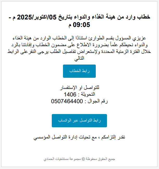 يتلقى مسؤول القسم إشعارًا عبر البريد الإلكتروني والرسائل النصية بوجود خطاب وارد من جهة خارجية.