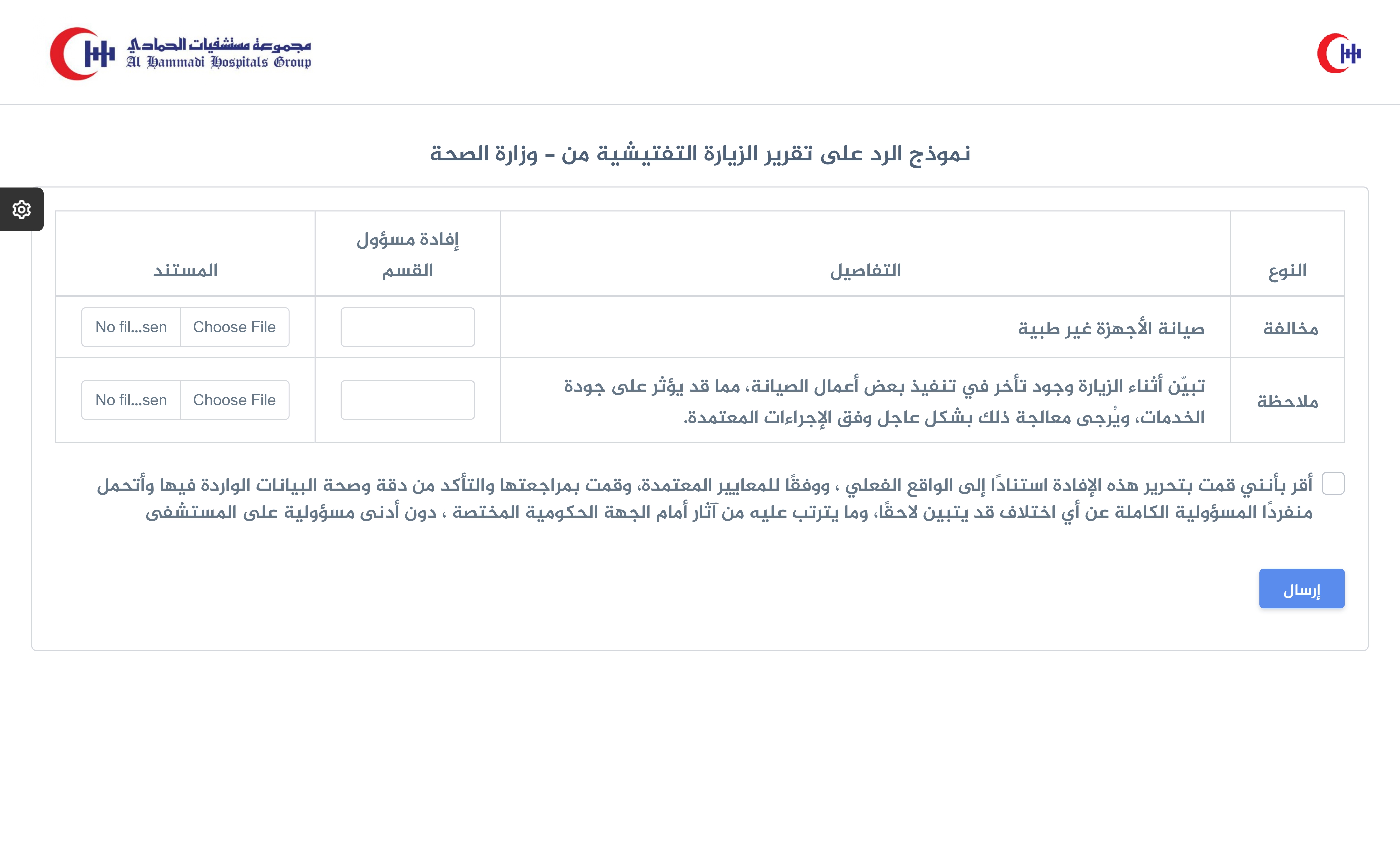 يفتح مسؤول القسم نموذج الرد على تقرير الزيارة ويبدأ بمعالجة البنود وفق الحقول التالية: