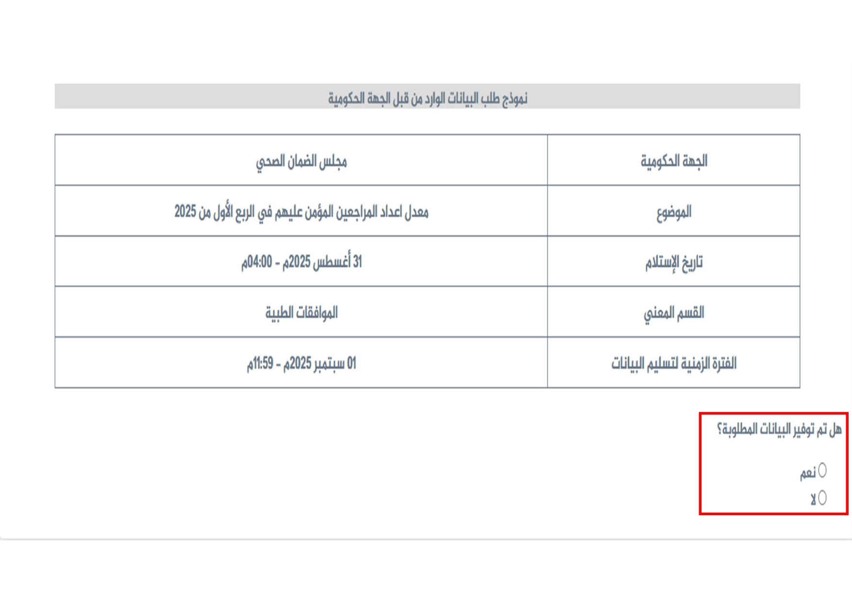 داخل نموذج الرد على إرجاع طلب البيانات، يجيب المسؤول على سؤال: هل تم توفير البيانات المطلوبة؟